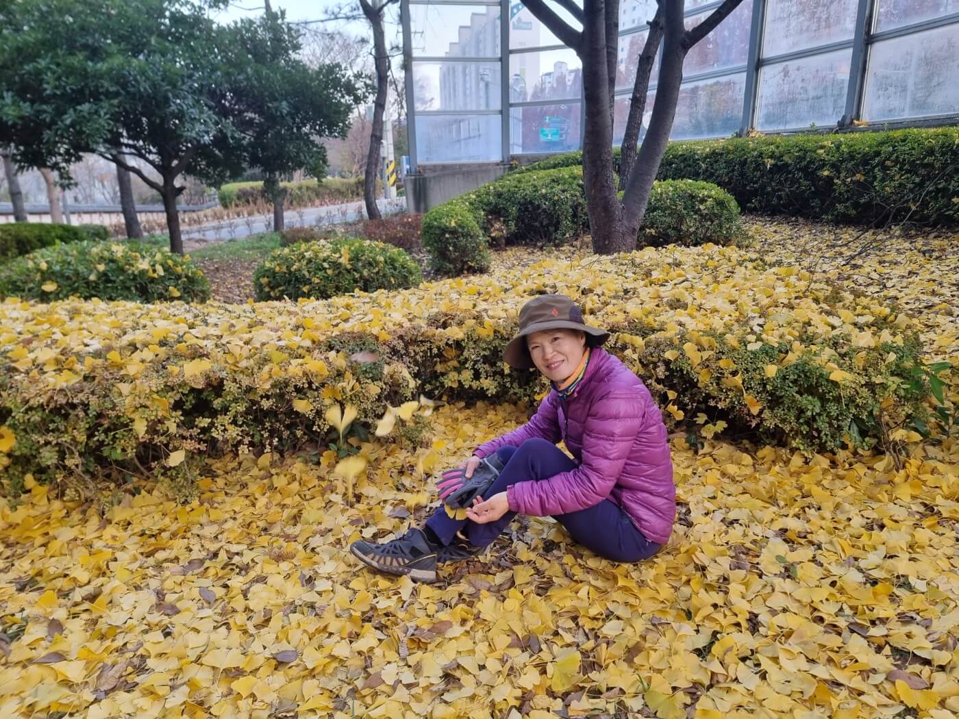 낮은 가로수 위에 떨어진 노란 은행잎은 그대로 한 송이 국화꽃 같다.