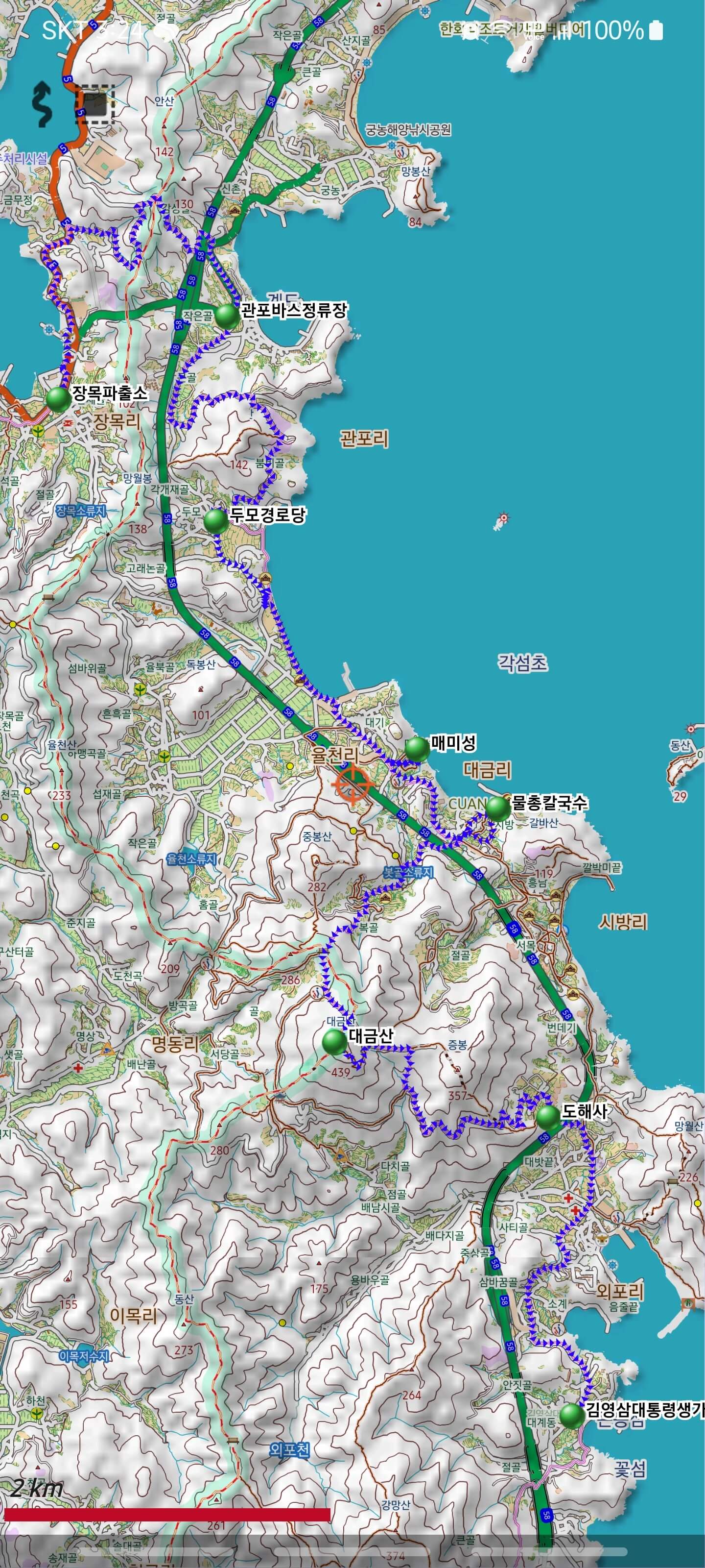 - 장목파출소<3.8km> 관포마을 <3.2km> 두모몽돌해수욕장 <7.5km> 외포초등학교 <1.9km> 김영삼대통령 생가( 16.4km, 실거리 18.22 km , 7시간 3분 소요)